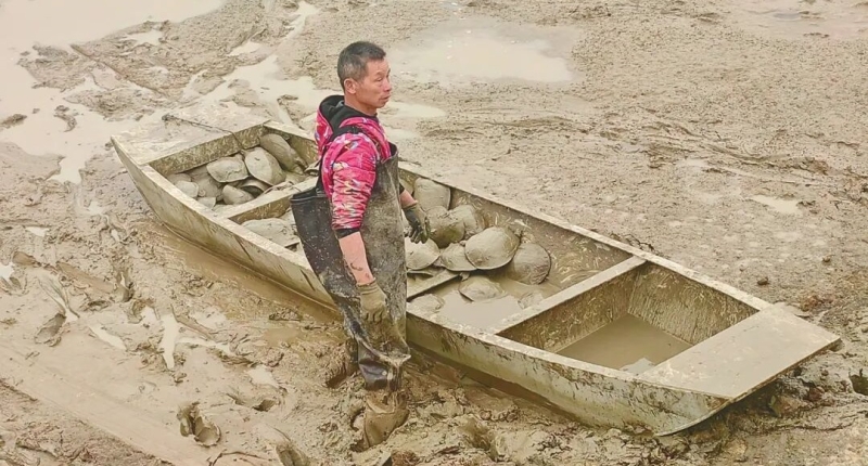 2月7日,天还蒙蒙亮,资阳区张家塞乡柞树村经济合作社的甲鱼养殖塘就已是一片繁忙景象,村民们穿着防水裤,手拉大网,弯腰在塘中熟练地探捞。“这边有个大的!”“小心别让它钻泥里!”吆喝声、水花声交织。