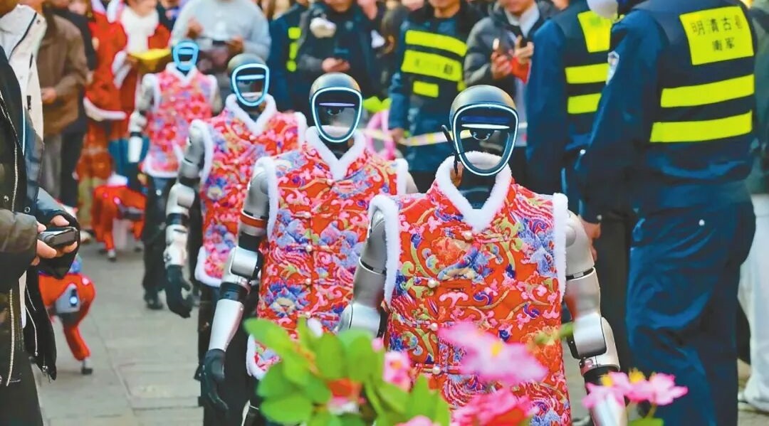 正月初六晚,资阳区明清古巷灯笼亮起,青石板路上人声渐沸。几台机器人踩着鼓点起舞,一台机器狗纵身前扑,两只前爪一抱,作了个揖,引来人群阵阵惊呼。这台机器人秀春节期间每天上演,场场爆满。