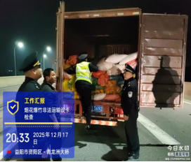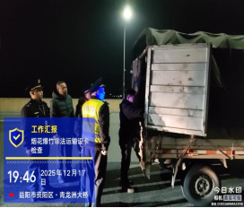 为深入贯彻落实《益阳市强化烟花爆竹安全管理和总量管控工作方案》(益应急联〔2025〕13号)的相关要求,从严管控烟花爆竹运输环节,2025年12月17日晚,益阳市交通运输综合行政执法支队资阳大队配合区应急管理局、资阳公安、交警部门,在进入资阳区的重要通道——青龙洲大桥区域,开展夜间突击联合执法行动。