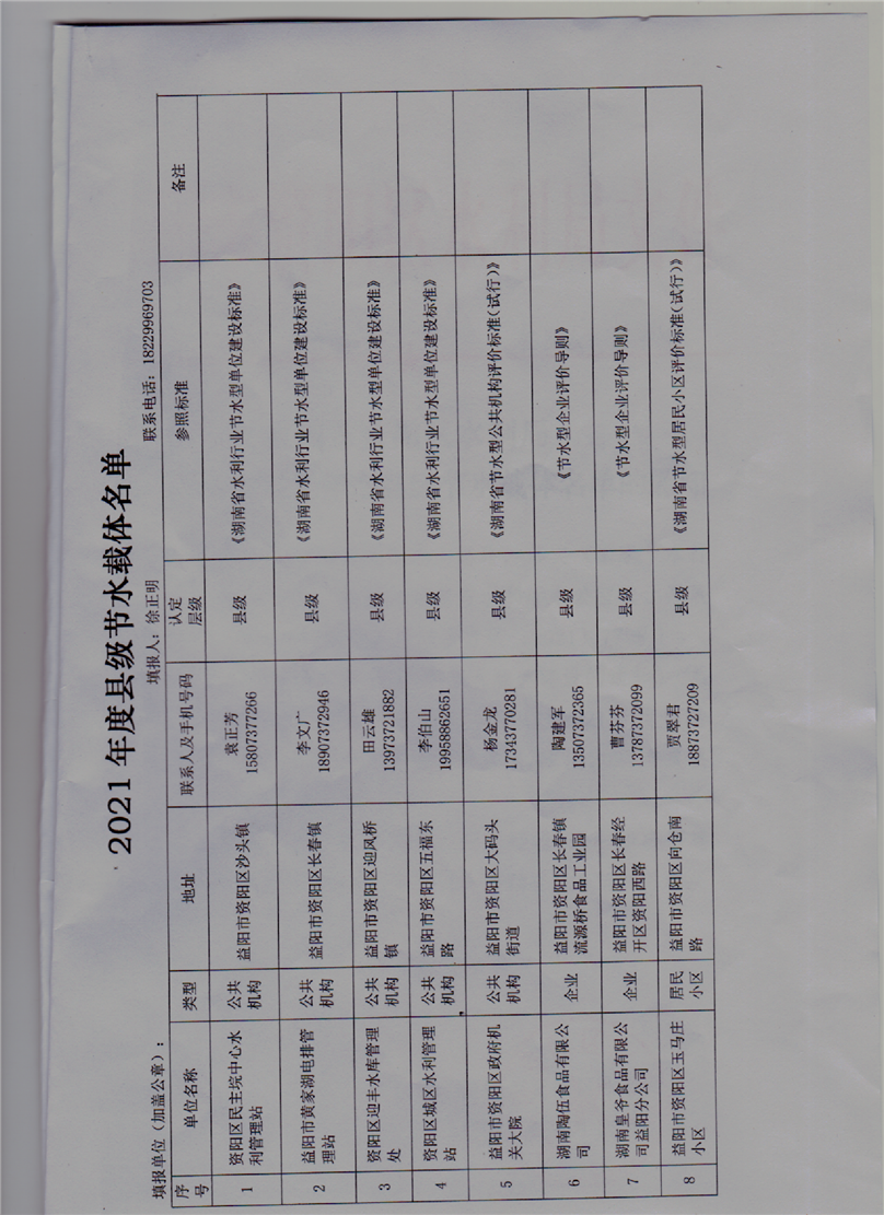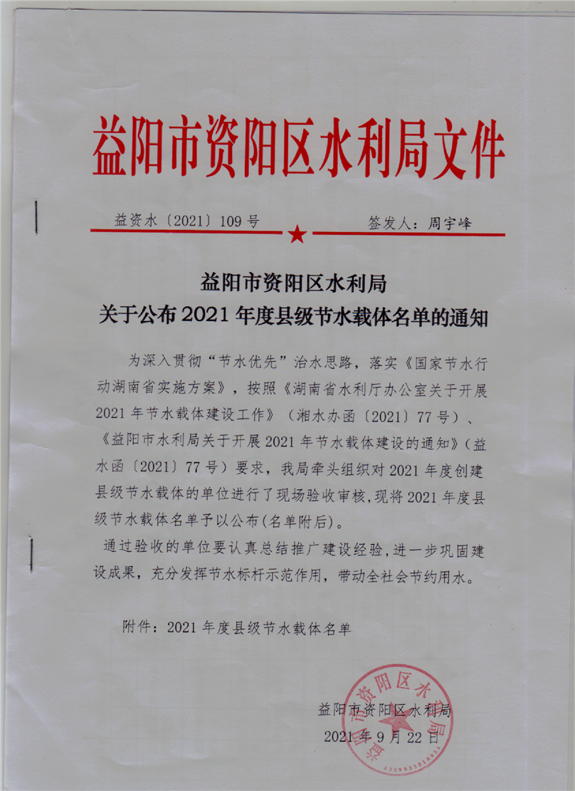 益阳市资阳区水利局关于公布2021年度县级节水载体名单的通知