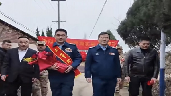 送喜报现场,横幅高举、锣鼓喧天,气氛热烈庄重。区退役军人事务局和区人武部相关负责人为廖勇家属佩戴“一人立功、全家光荣”绶带,送上立功喜报、牌匾和奖励金,并与军属亲切交谈,详细了解他们的家庭生活情况和身体状况,感谢他们为国家培养了优秀人才,为部队送去了飞行精英。