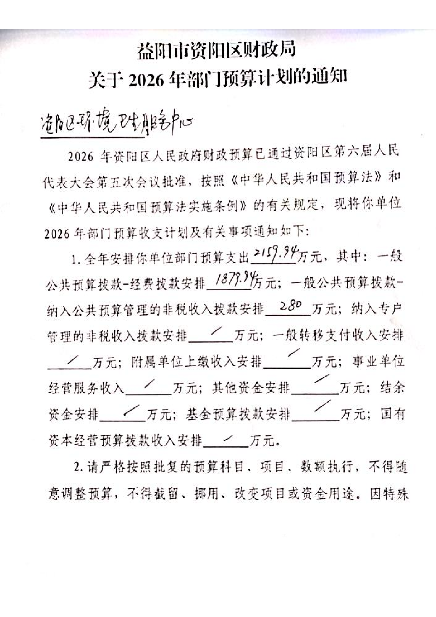 资阳区环境卫生服务中心2026年部门预算计划