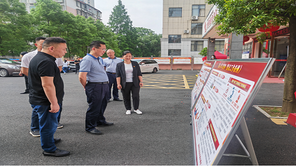 (鄢建忠一行在金花坪社区调研。图为在社区参观《信访工作条例》宣传展板)