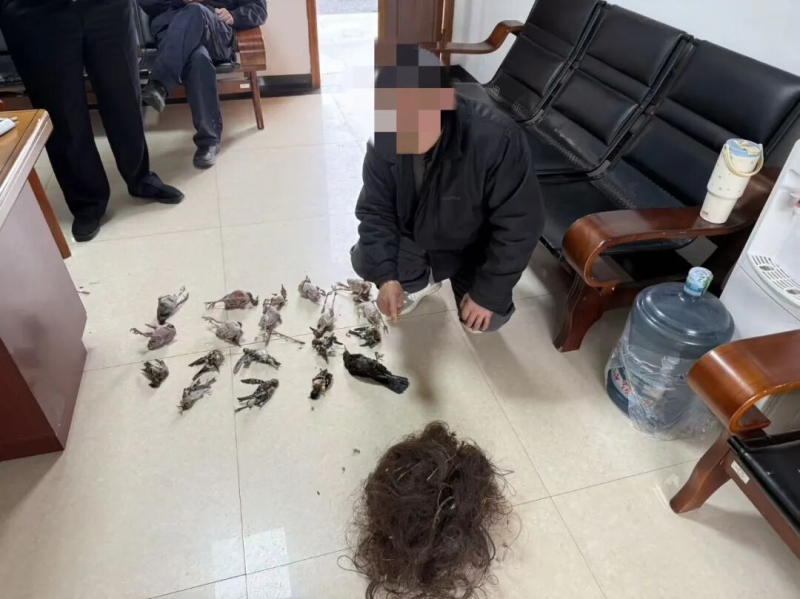 巡查过程中,执法人员在一菜地上发现捕鸟网,当场从网上查获野生鸟类9只,随后,执法人员在菜地主人家中查获已褪毛的野生鸟类10只。根据现场查获情况,执法人员依法将放置捕鸟网的非法狩猎嫌疑人熊某某控制。