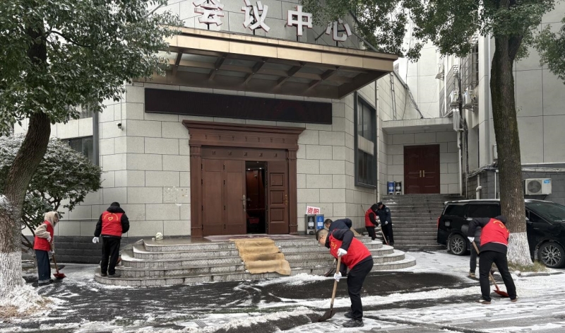 “全体干部职工迅速到岗,开展扫雪除冰作业!”随着降雪如期而至,中心工作群里的紧急通知一经发出,不到5分钟,13名干职工便手持清雪工具,在机关大院裙楼过道、会议中心走道挥舞铁锹铲冰除雪,干部职工们分工协作、默契配合,有的专注于台阶、坡道等易滑区域人工清扫,有的忙着铺设防滑麻袋、设置安全警示牌,寒风中回荡着铁锹与地面的撞击声,雪地里跃动着忙碌的身影。