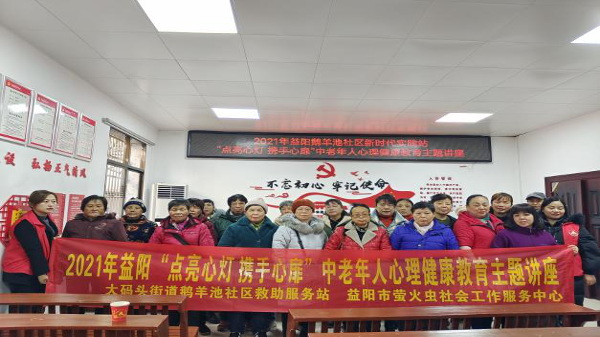 12月30日,大码头街道鹅羊池社区社会救助站联合萤火虫社会服务工作中心开展以“点亮心灯 携手心扉”为主题的中老年人心理健康教育讲座,把尊老敬老爱老付诸实际行动中。